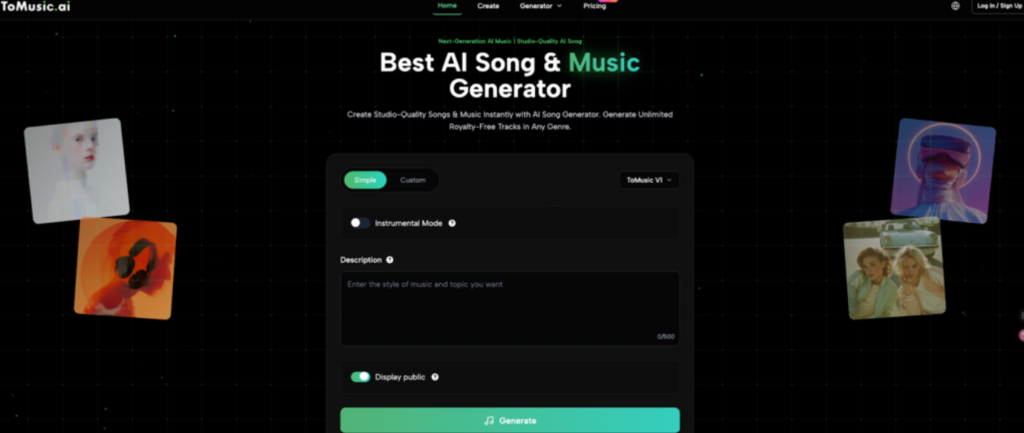 Below is a workflow written to match the exact elements shown in the Tomusic generator page: Simple/Custom, model selector, Instrumental Mode, Description (0–500), Display public, Required Credits, and Generate.